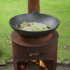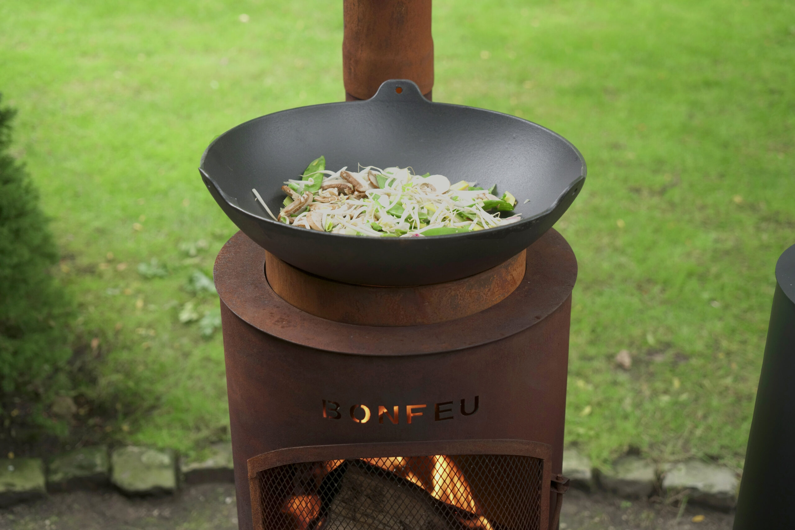 Der Kamin wird mit einem Deckel geliefert und Sie können diesen Deckel einfach durch drei verschiedene Dinge ersetzen: den BBQ-Grill, den Wok-Ring oder die Plancha. Alle drei werden beim Abnehmen des Deckels auf den BonTino gelegt. Sie können den Deckel auch umdrehen und ihn als Kochplatte verwenden, um beispielsweise eine Kanne Tee zuzubereiten. Und während Sie das alles tun, können Sie immer noch das Feuer darunter geniessen.