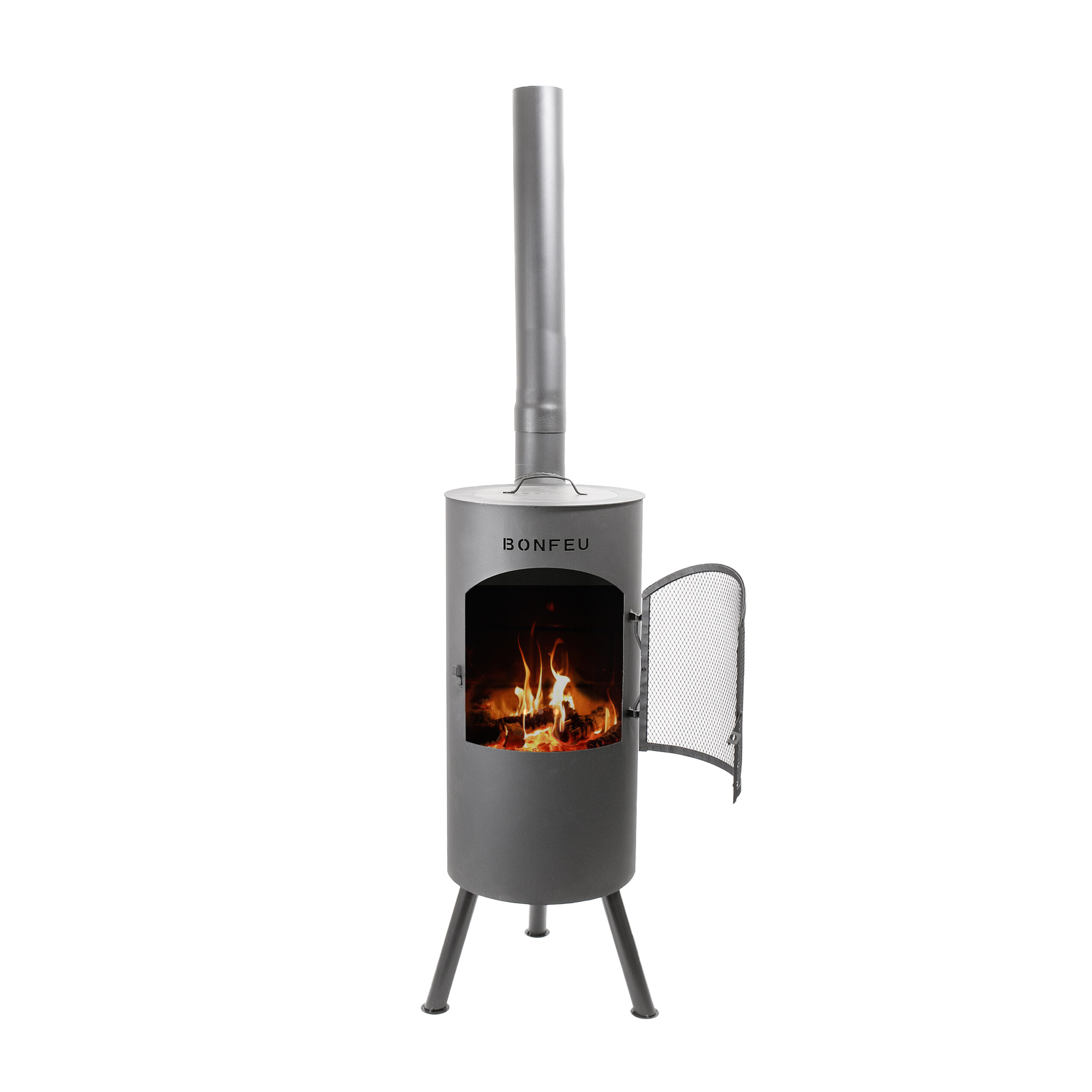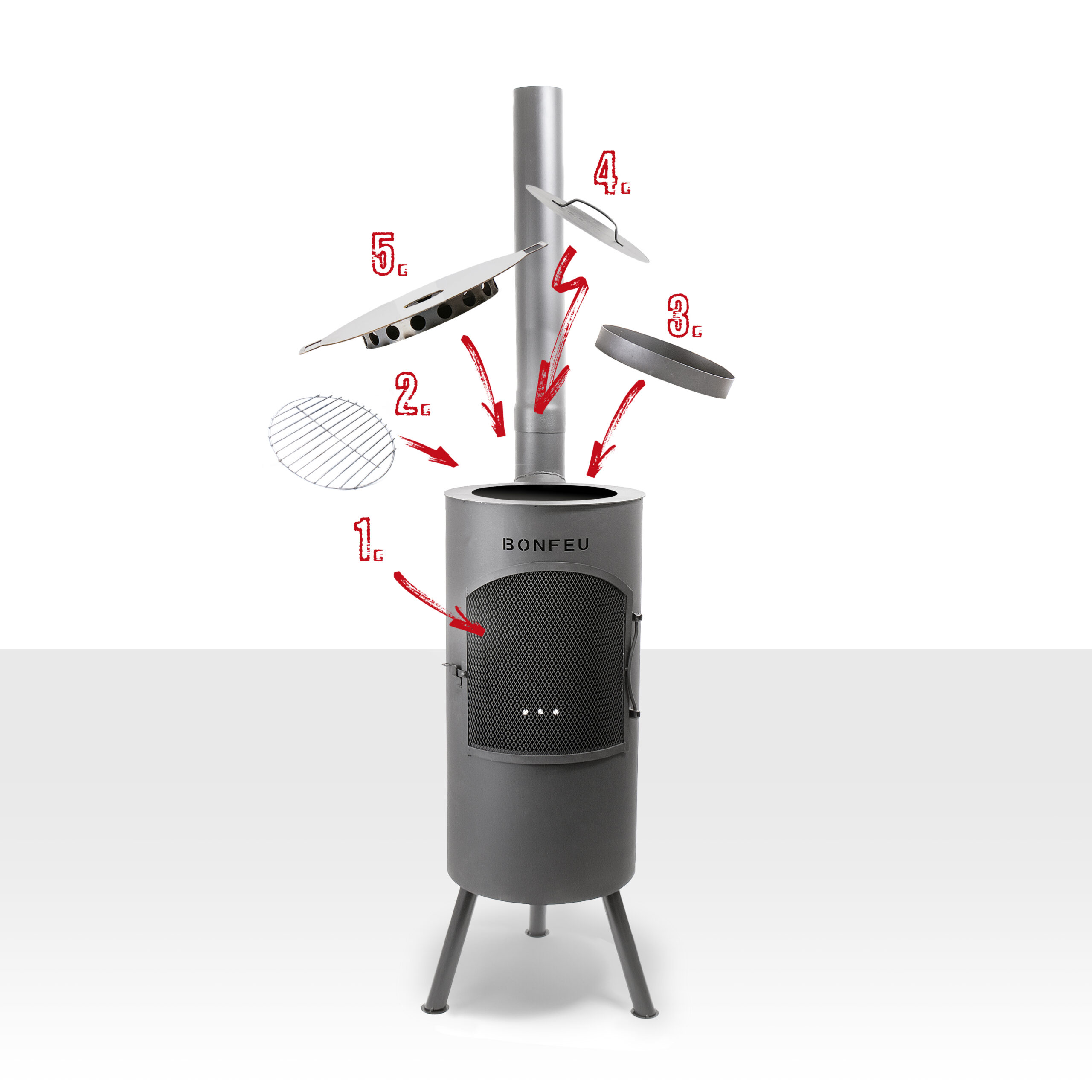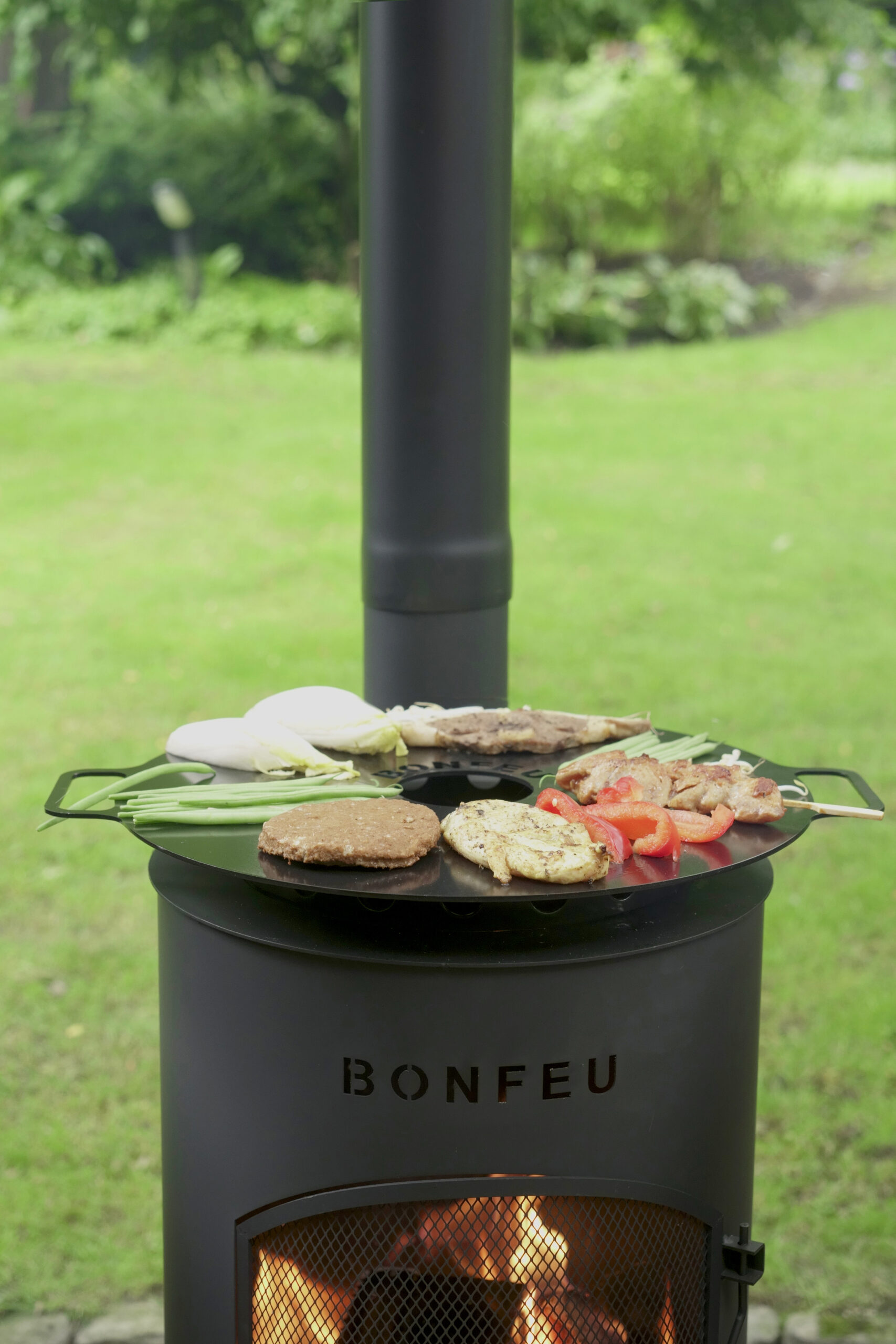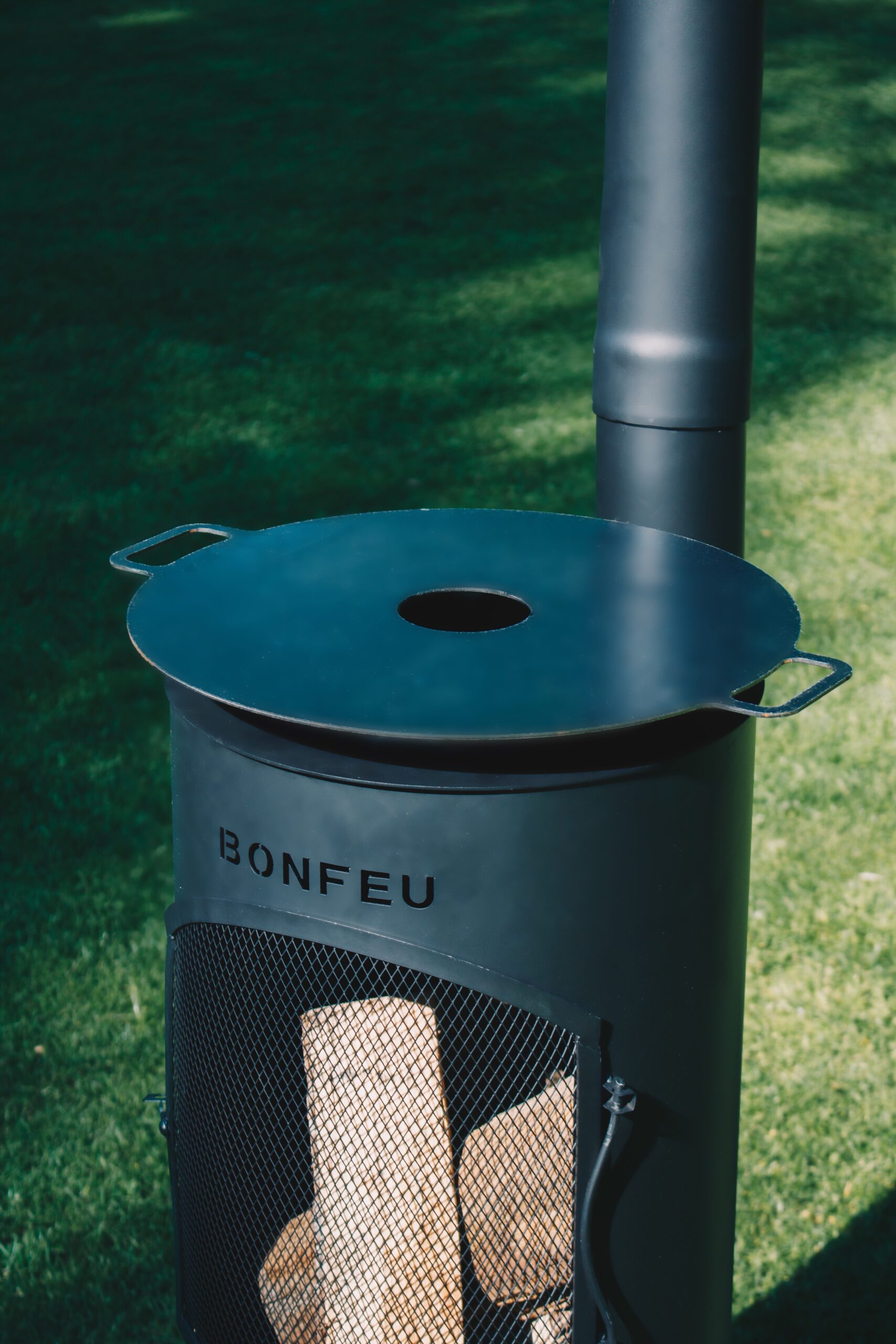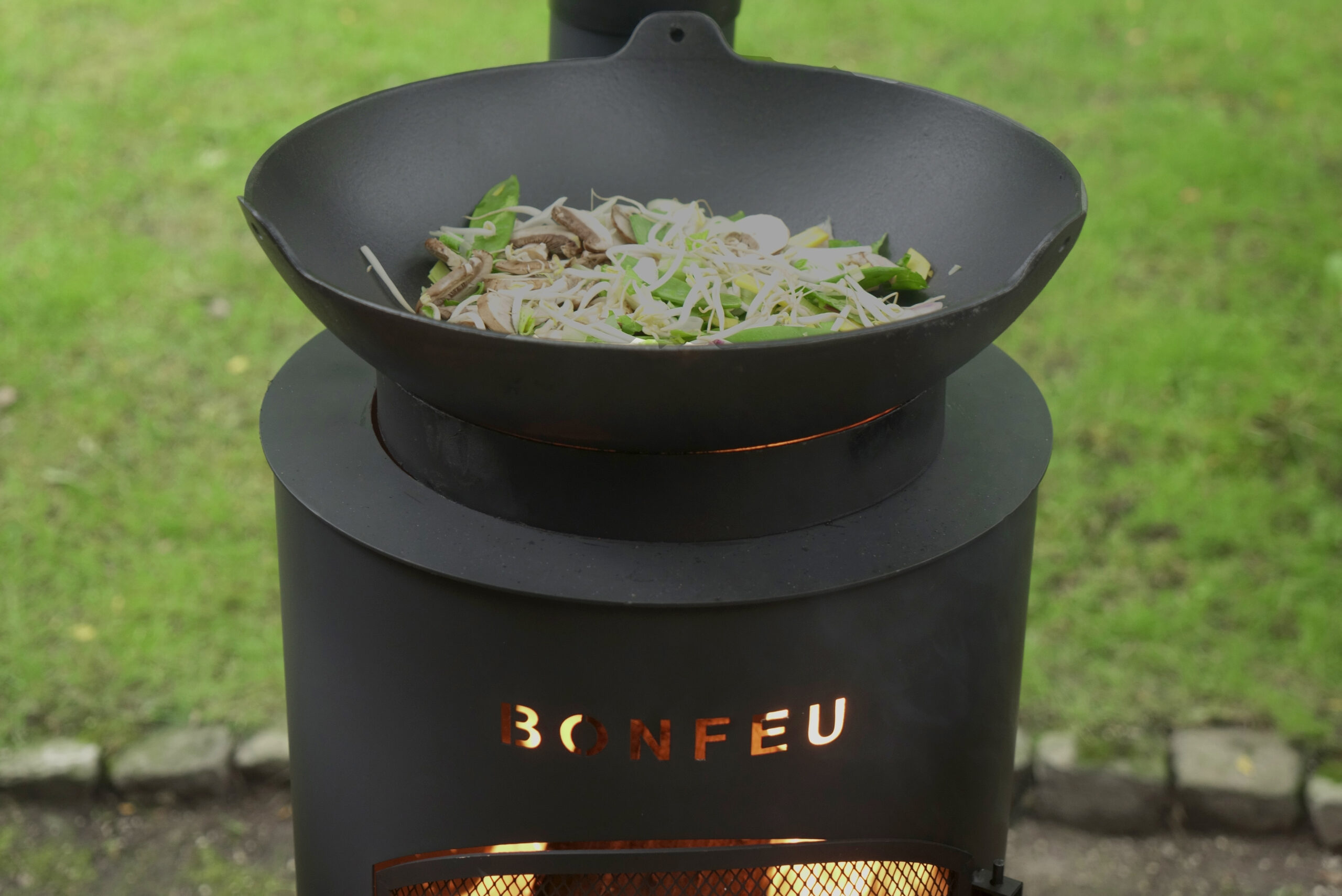 Der Kamin wird mit einem Deckel geliefert und Sie können diesen Deckel einfach durch drei verschiedene Dinge ersetzen: den BBQ-Grill, den Wok-Ring oder die Plancha. Alle drei werden beim Abnehmen des Deckels auf den BonTino gelegt. Sie können den Deckel auch umdrehen und ihn als Kochplatte verwenden, um beispielsweise eine Kanne Tee zuzubereiten. Und während Sie das alles tun, können Sie immer noch das Feuer darunter geniessen.