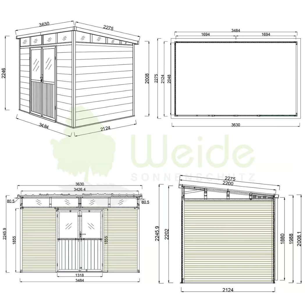Mit kompakten Massen von 338 × 218 × 226 cm passt der Schuppen auch in kleinere Gärten und Terrassen, ohne dabei viel Platz zu beanspruchen.