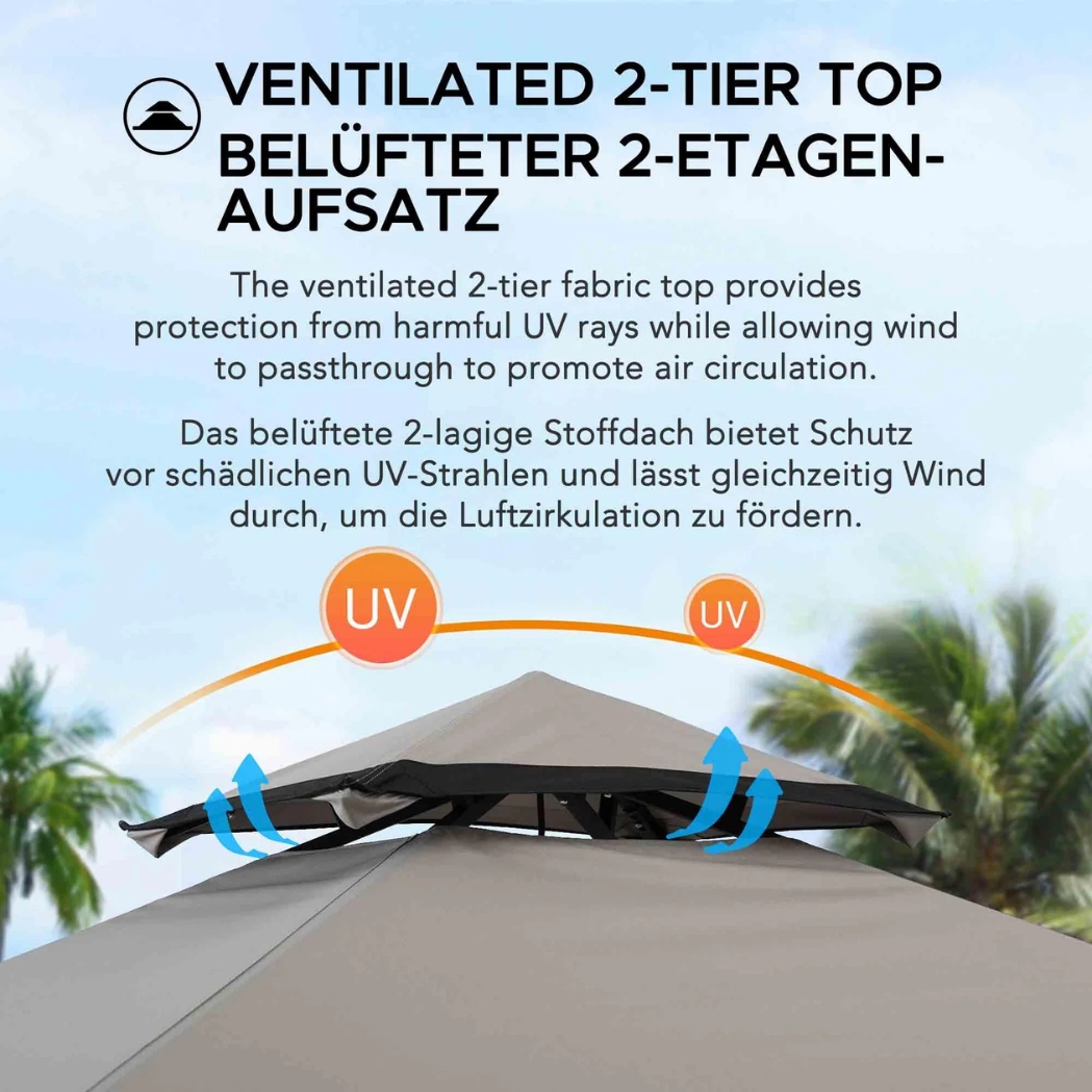 Dieser Grillpavillion wurde entwickelt damit Sie, ihre Grillzeit im Garten in vollen Zügen geniessen können. Die 152 cm x 244 cm rostbeständige und pulverbeschichtete Stahlkonstruktion, die eine wetterbeständige Überdachung trägt, schützt nicht nur Ihren Grill, sondern hält Sie auch während des Grillens trocken und kühl. Riskieren Sie in Zukunft nie wieder im Regen zu stehen, während Sie Ihren Burger wenden. Das 2-stufige Dach hilft, Rauch zu entlüften. Praktisches Zubehör wie Haken für Grillutensilien und Einbauregale machen ihn funktional und attraktiv. Mit der leicht verständlichen Aufbauanleitung geniessen Sie im Handumdrehen ein perfekt gegrilltes Steak.