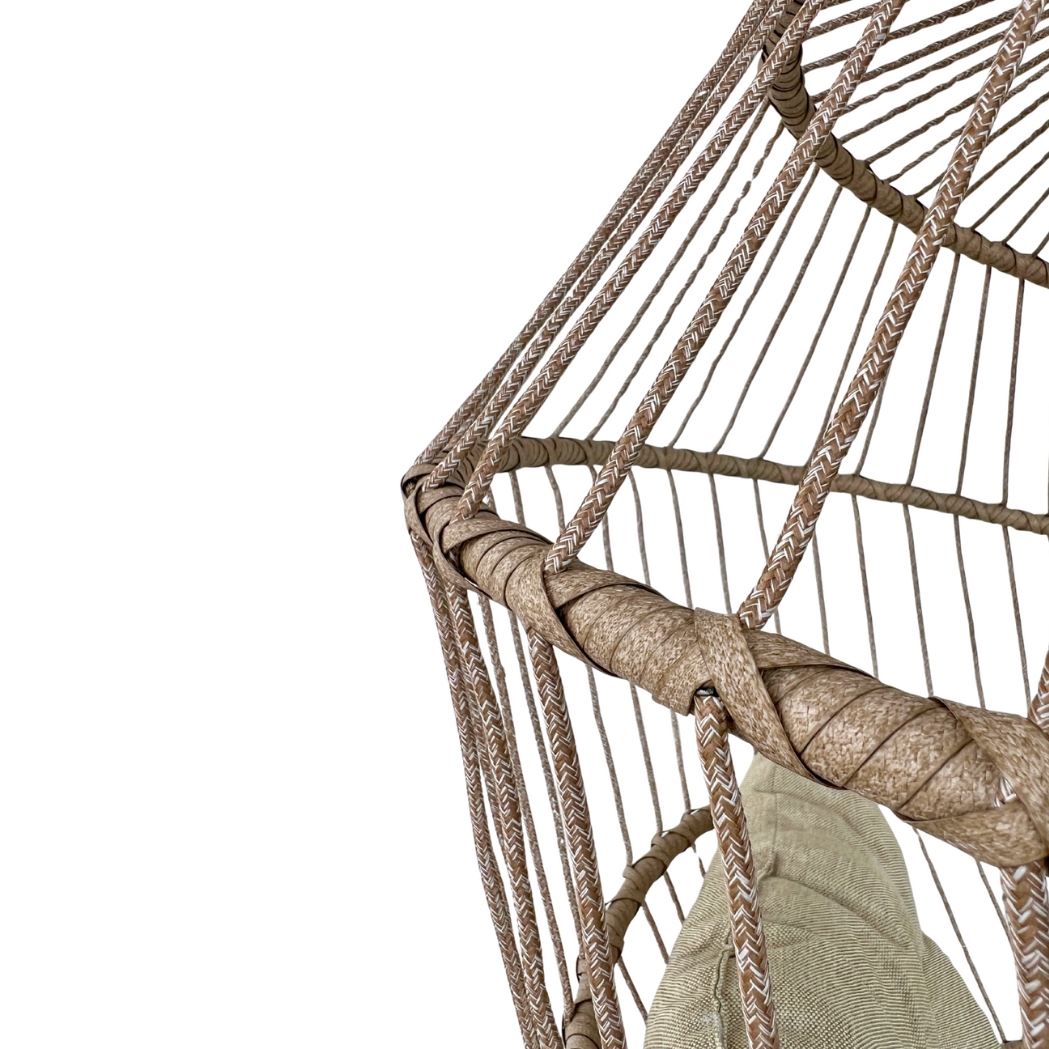 Unsere Hängesessel mit Gestell aus robustem Polyrattan und verzinktem Stahl sind speziell für den Outdoor-Bereich konzipiert. Sie sind wetterfest, UV-beständig und rostfrei – perfekt für Garten, Balkon oder Terrasse. Der stabile Ständer sorgt für Sicherheit, während die elegante Form des Sessels Gemütlichkeit ausstrahlt. Mit farbigen Gartenkissen oder Accessoires wird dein Hängesessel zum persönlichen Wohlfühlplatz unter freiem Himmel.