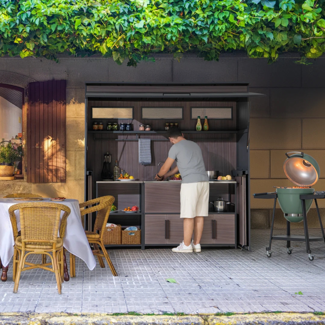 Seine Struktur aus Metall ihm Stabilität und macht ihn gleichzeitig robust genug für den Einsatz in Ihrem Garten und anderen Räumen. Kombinieren Sie es mit dem Outdoor-Küchenregal, dem Outdoor-Küchenkühler, der Outdoor-Küchenspüle und der Outdoor-Küchen-Vorbereitungsstation, die im Set enthalten sind, um Ihre Outdoor-Küche an Ihre Platz- und Kochbedürfnisse anzupassen.