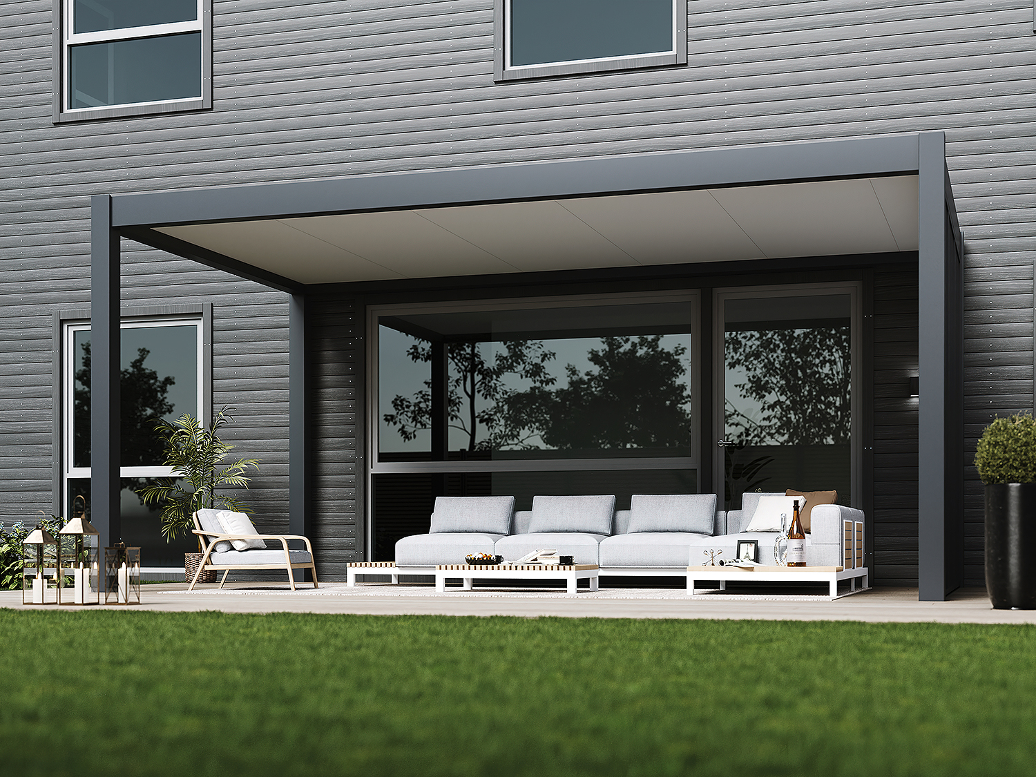Personalisieren Sie Ihren Aussenbereich nach Ihren Wünschen. Unsere Carport bietet flexible Gestaltungsmöglichkeiten, wie etwa eine optionale Lamellenwand. Mit geringem Wartungsaufwand und vollständig recycelbarem Aluminium ist sie nicht nur strapazierfähig, sondern auch umweltfreundlich. Diese Pergola ist die perfekte Wahl für ein anspruchsvolles, unkompliziertes Outdoor-Erlebnis.