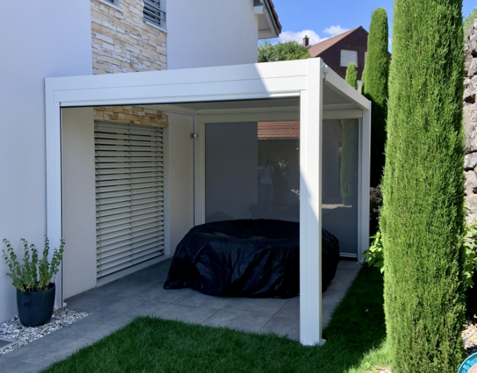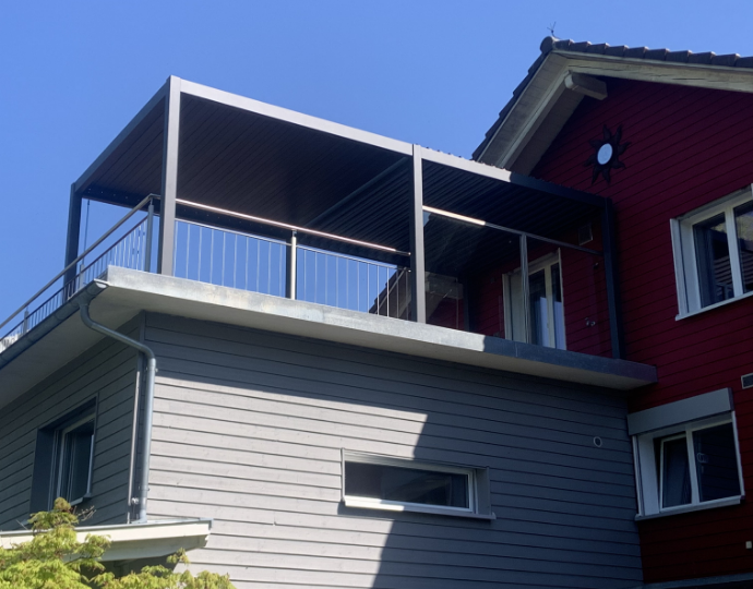 Freiluftdächer als Wand-Pergola oder freistehend mit einem völlig integrierten Dachsystem. Diese Pergola von Sorara hat sich bei grosser Hitze bestens bewährt. Auch eine Entwässerungsmöglichkeit, welche über die vier Pfosten abgeleitet wird, ist integriert.
