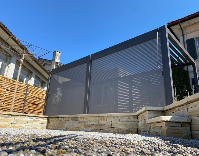 Die Ventaris bioklimatische Lamellendach Pergola ermöglicht eine natürliche Belüftung und Temperaturregelung, indem sie sich den Wetterbedingungen anpasst. An heissen Tagen können die Lamellen geöffnet werden, um Schatten zu spenden und die Luftzirkulation zu fördern, während an kühleren Tagen oder bei Regen die Lamellen geschlossen werden können, um Schutz zu bieten.