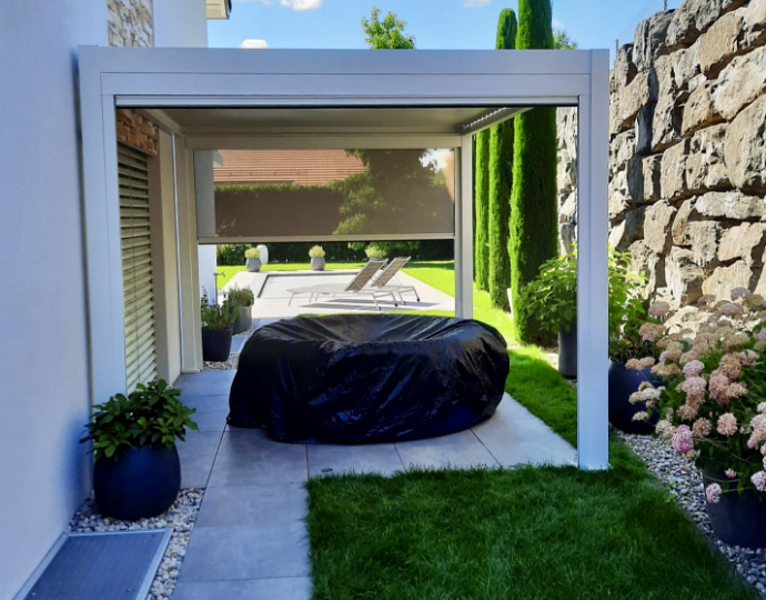 Sie sind besonders attraktiv im Hinblick auf eine harmonische Sonnen-Schattenregulierung. Mit den farblich abgestimmten Sonnenrollos und Seiten-Wandelementen aus Textilgewebe lassen sich die Pergolen wind- und wetterbeständiger machen. Mit guter Qualität bereiten stimmige Material-Konstruktionen bestehend aus Gerüst und Terrassenüberdachung sowie hochwertigen Konstruktionsprofilen, lange Freude.