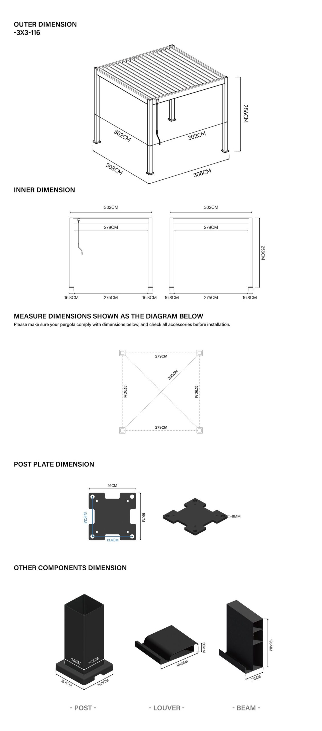 Montage-Hinweis: Die Pergola muss auf einem soliden Untergrund (z. B. Betonfundamente) montiert werden. Die passenden Dehnschrauben für die Bodenbefestigung sind im Lieferumfang enthalten. Achten Sie auf eine rechtwinklige und ebene Verlegung der Bodenplatten.