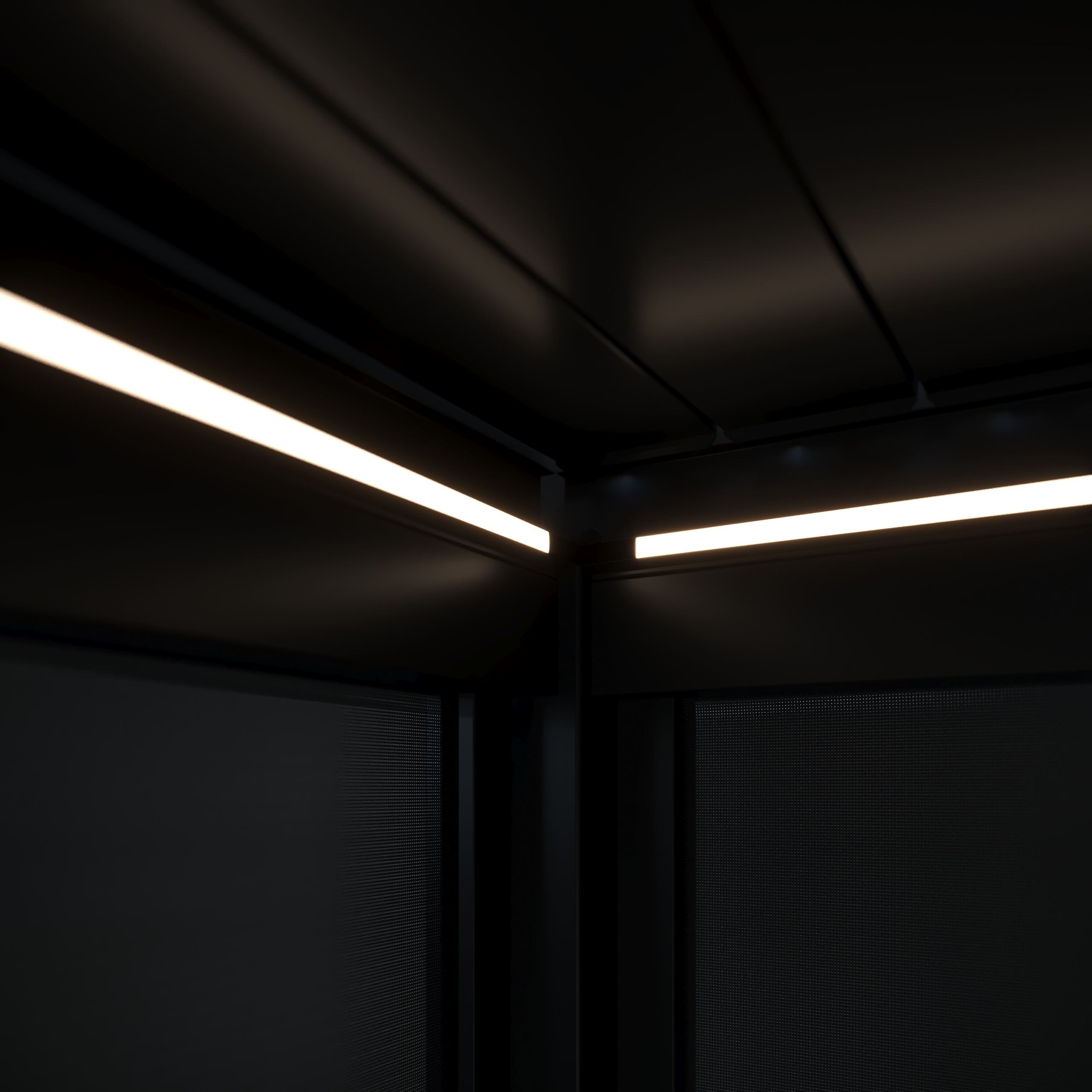 - Die VENTARIS Pergola ist mit einem erstklassigen RGB-Diffus-Beleuchtungssystem ausgestattet, das einen Hauch von Raffinesse verleiht und die Stimmung für Ihren Aussenbereich setzt. Mit einer Reihe von Farben zur Auswahl können Sie die Beleuchtung an Ihre Vorlieben anpassen. Das umlaufende LED-Beleuchtungssystem wird innenliegend rundherum eingeklickt und durch wasserdichte Verbindungsstecker angeschlossen.