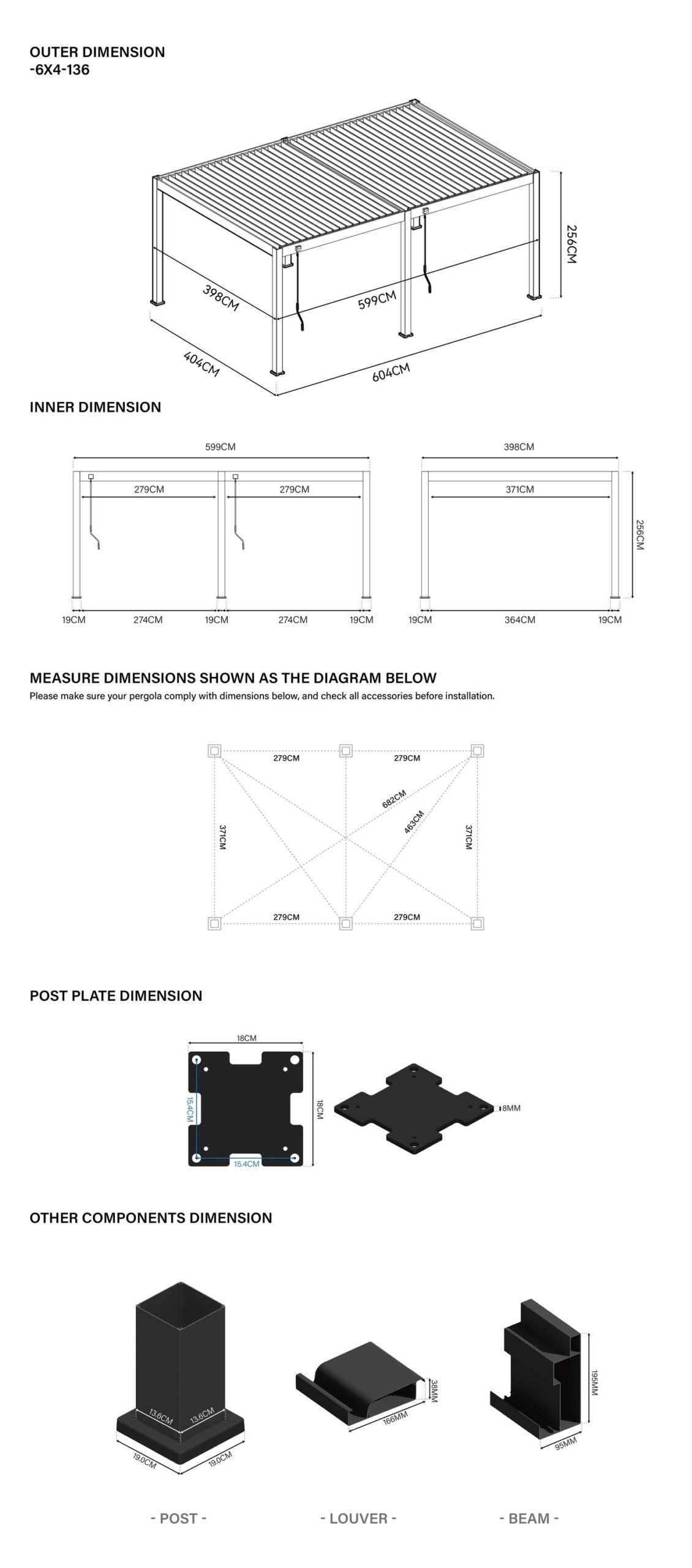 Montage-Hinweis: Die Pergola muss auf einem soliden Untergrund (z. B. Betonfundamente) montiert werden. Die passenden Dehnschrauben für die Bodenbefestigung sind im Lieferumfang enthalten. Achten Sie auf eine rechtwinklige und ebene Verlegung der Bodenplatten.