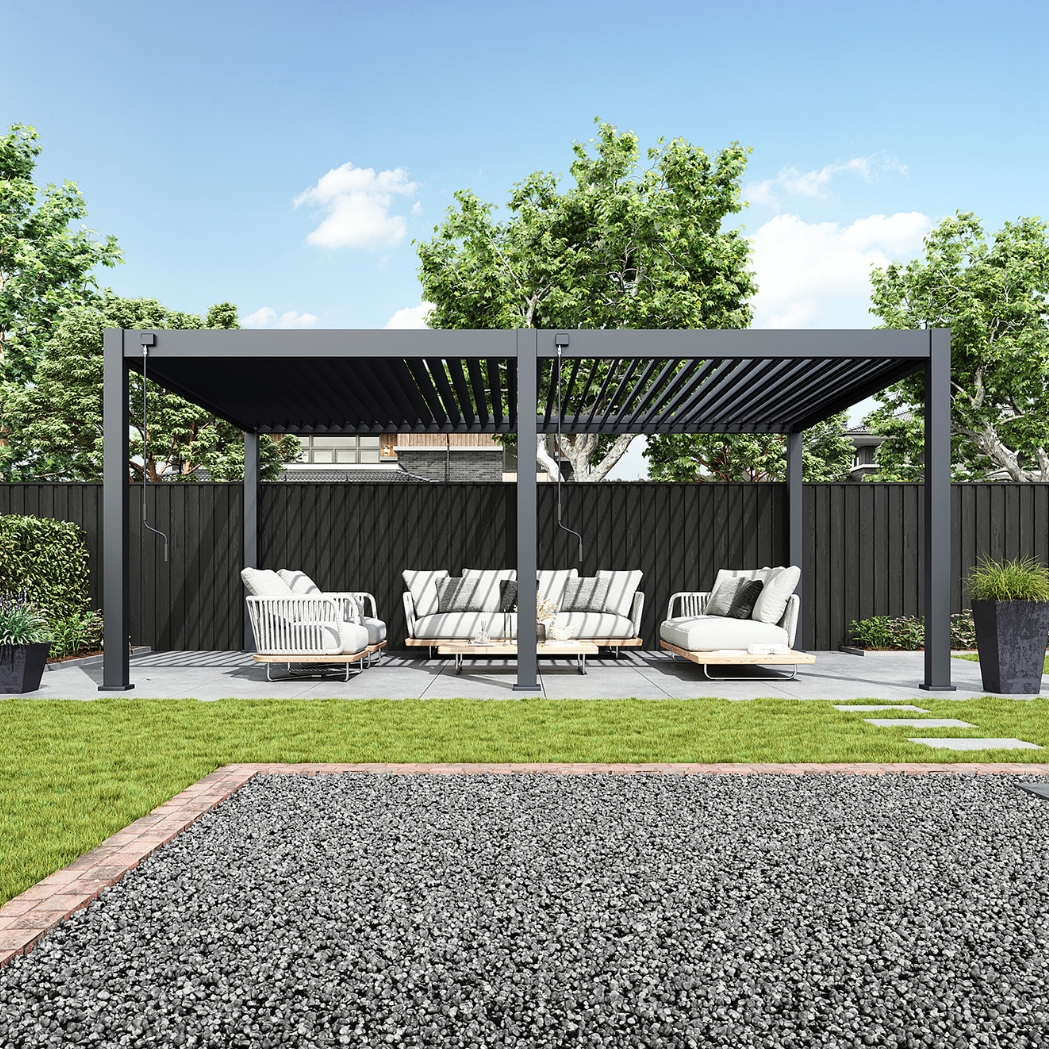 - Ganzjähriger Schutz: Die Lamellen lassen sich bis zu 135° neigen, sodass Sie bei jedem Sonnenstand den perfekten Schattenplatz finden.