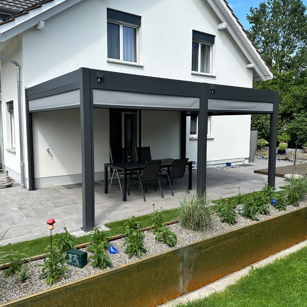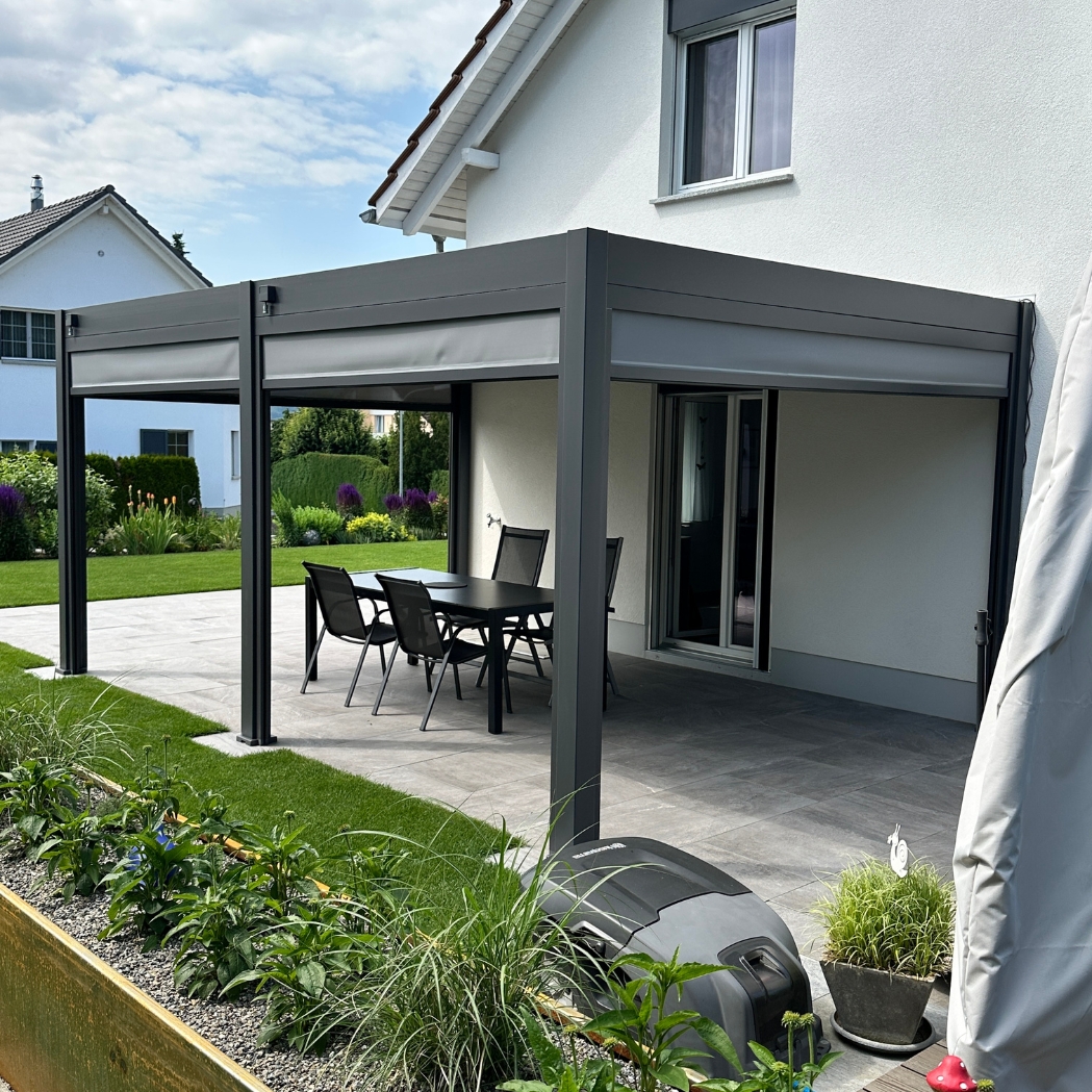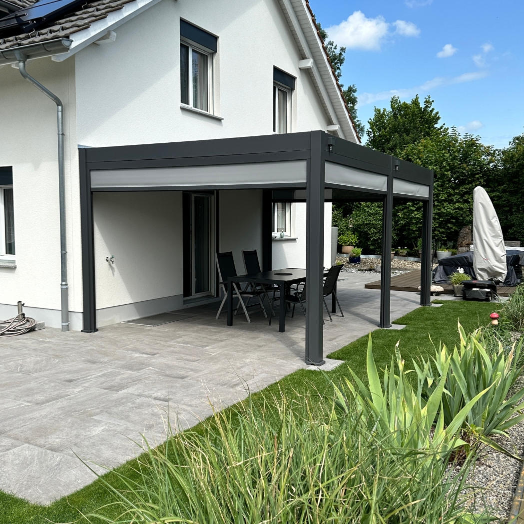 - Ganzjähriger Schutz: Die Lamellen lassen sich bis zu 135° neigen, sodass Sie bei jedem Sonnenstand den perfekten Schattenplatz finden.