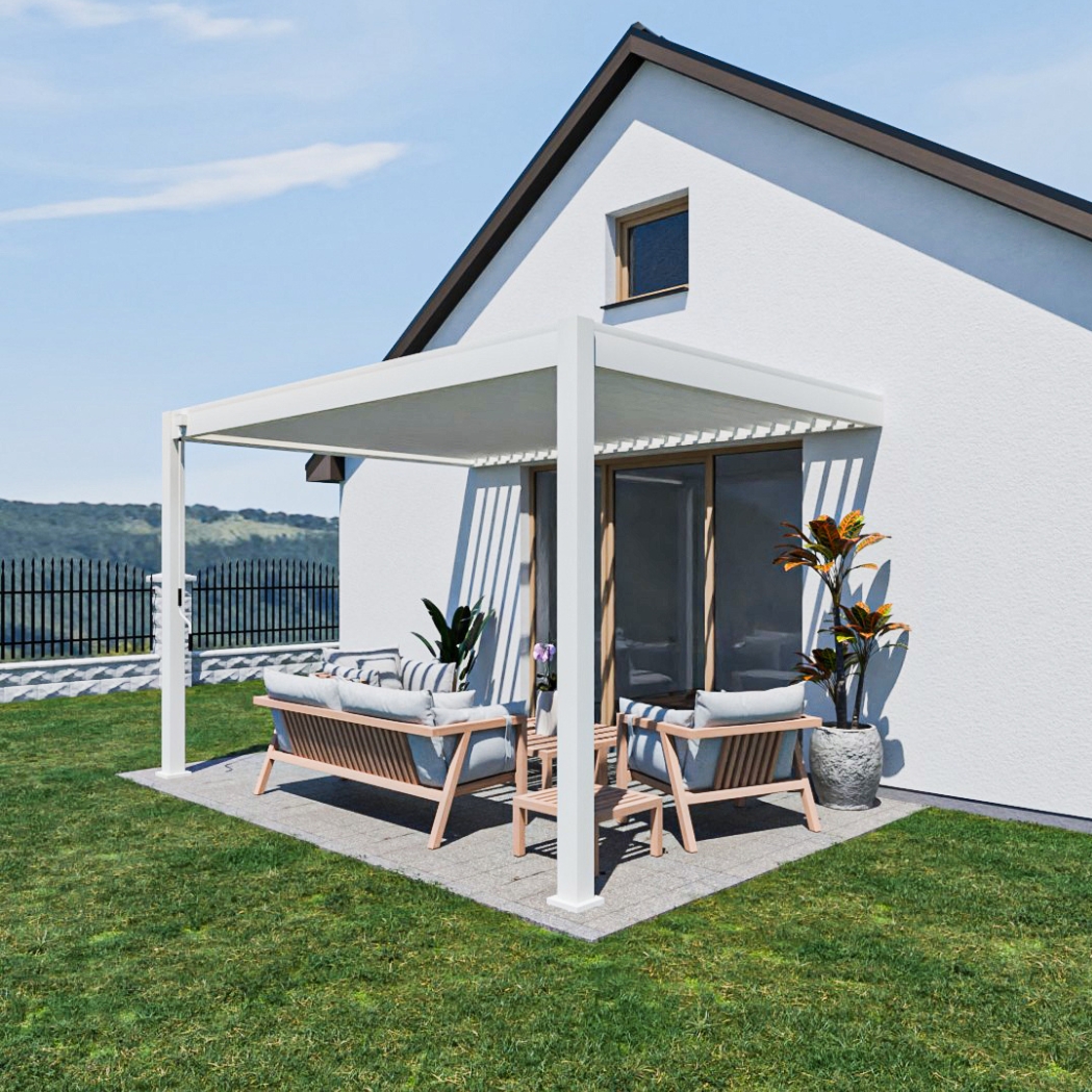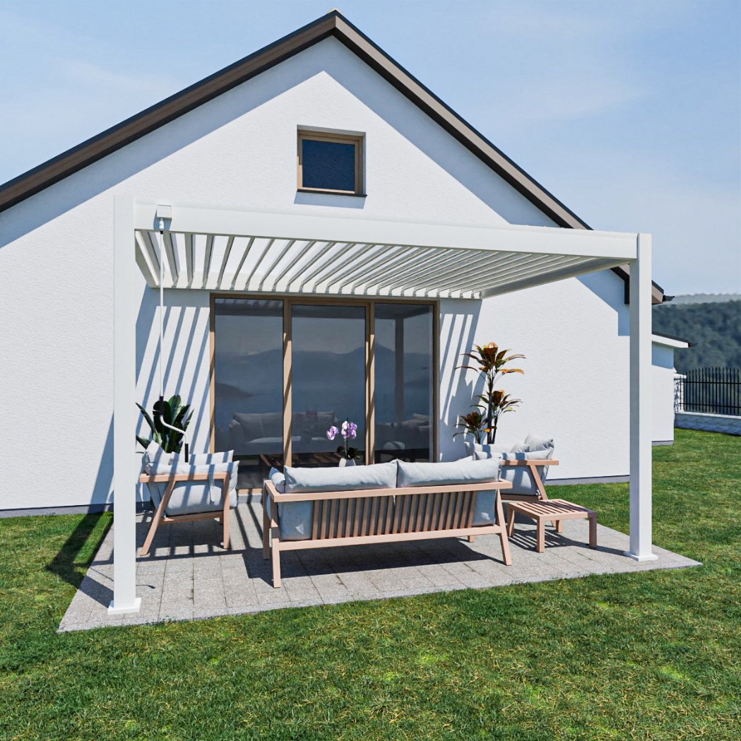 Das einzigartige schwenkbare Lamellendach der Weide Pergola bietet viele Möglichkeiten zum Schutz vor Sonne, Regen und Wind. Wenn die Lamellen geschlossen sind, ist das Dach komplett wasserabweisend. Das Wasser wird über das innovative integrierte Wasserablaufsystem direkt und kontrolliert abgeleitet.
