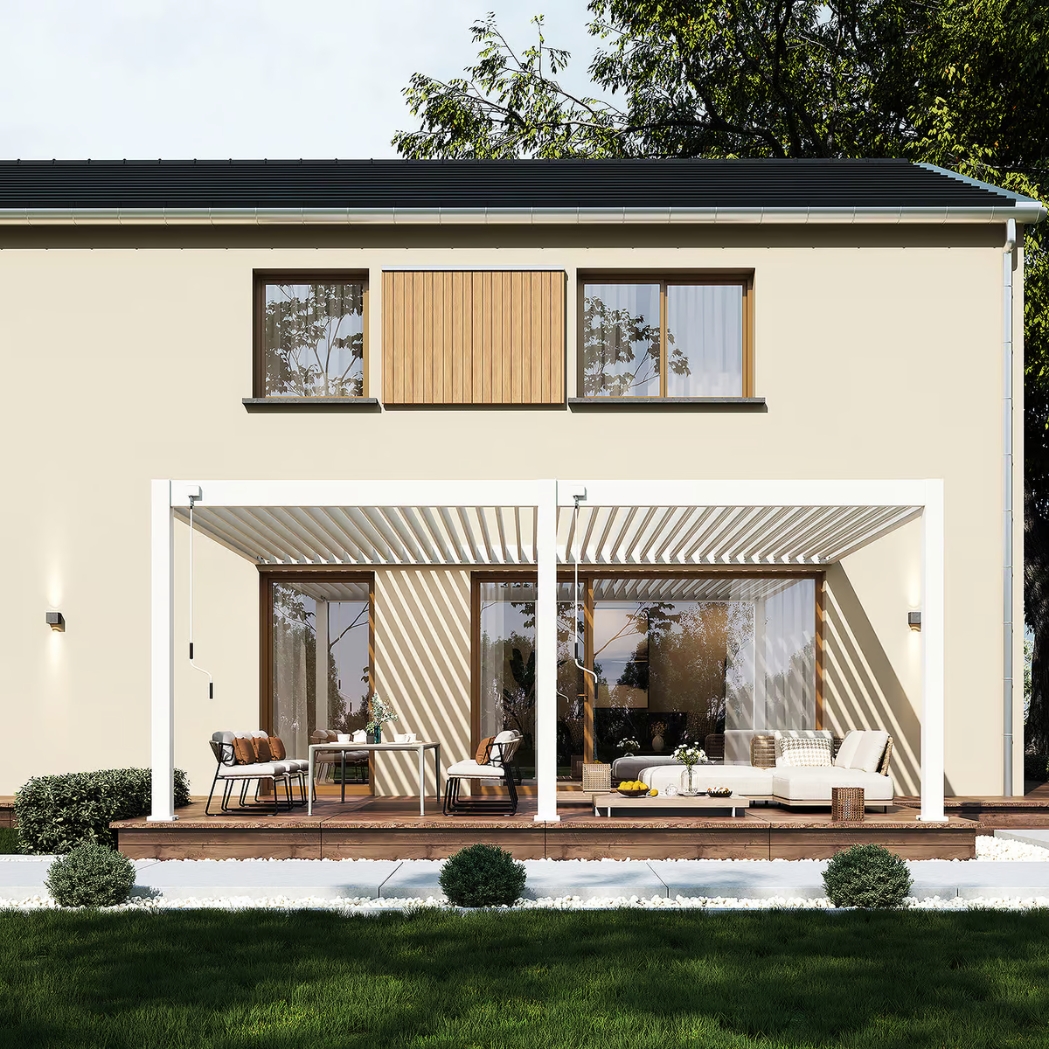 Die hochwertigen Aluminiumlamellen lassen sich bequem und stufenlos einstellen. Durch das Drehen einer Kurbel können Sie den Neigungswinkel der Lamellen synchron verändern, um den Lichteinfall individuell anzupassen. Bei vollständig geschlossenen Lamellen bietet die Pergola Schutz vor Sonne und leichtem Regen.